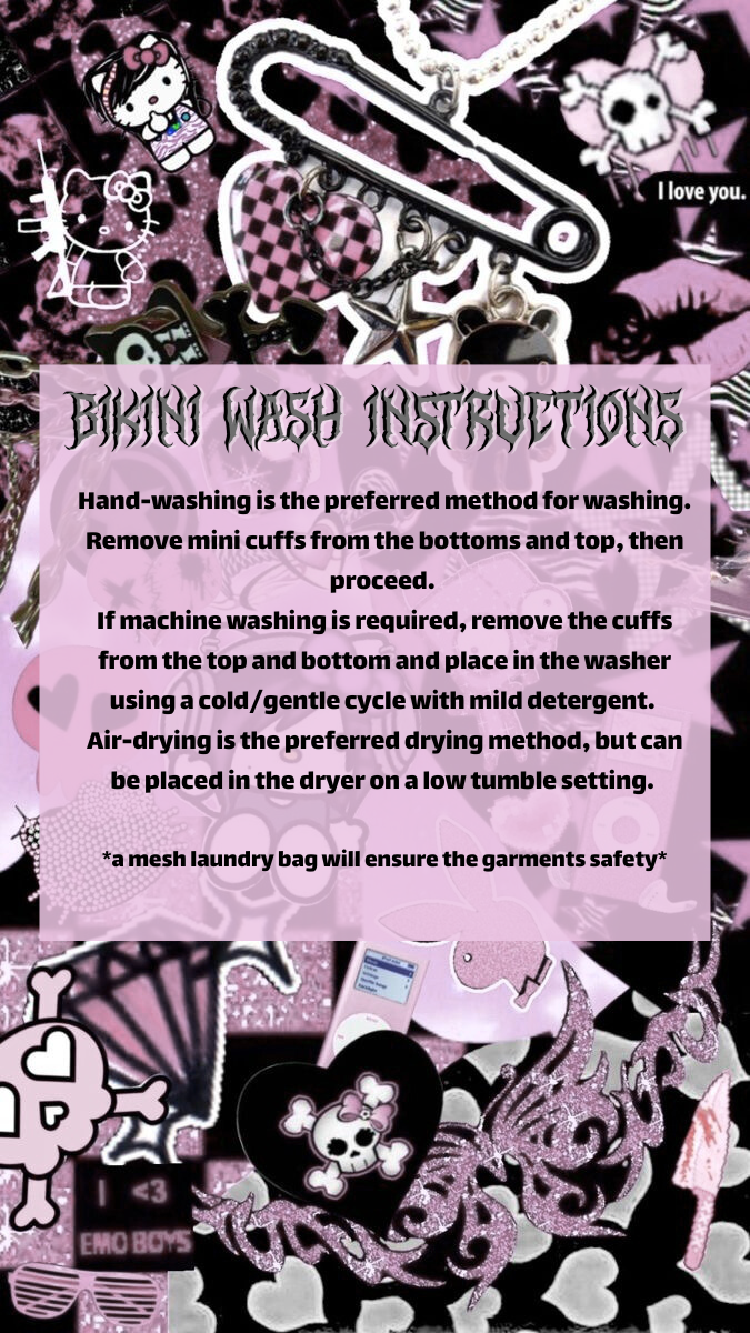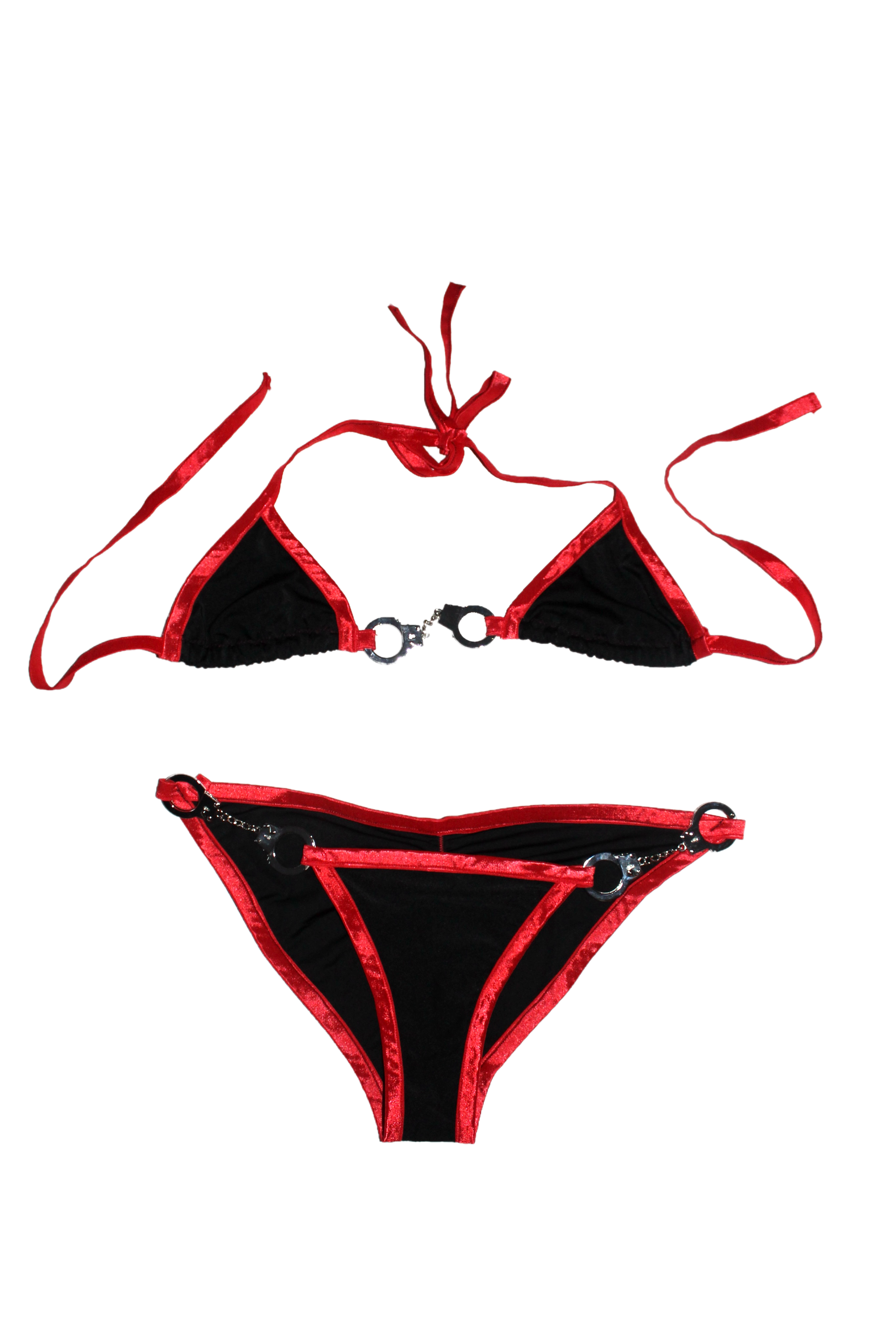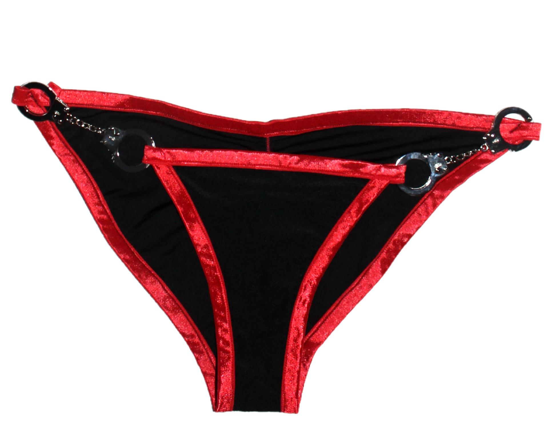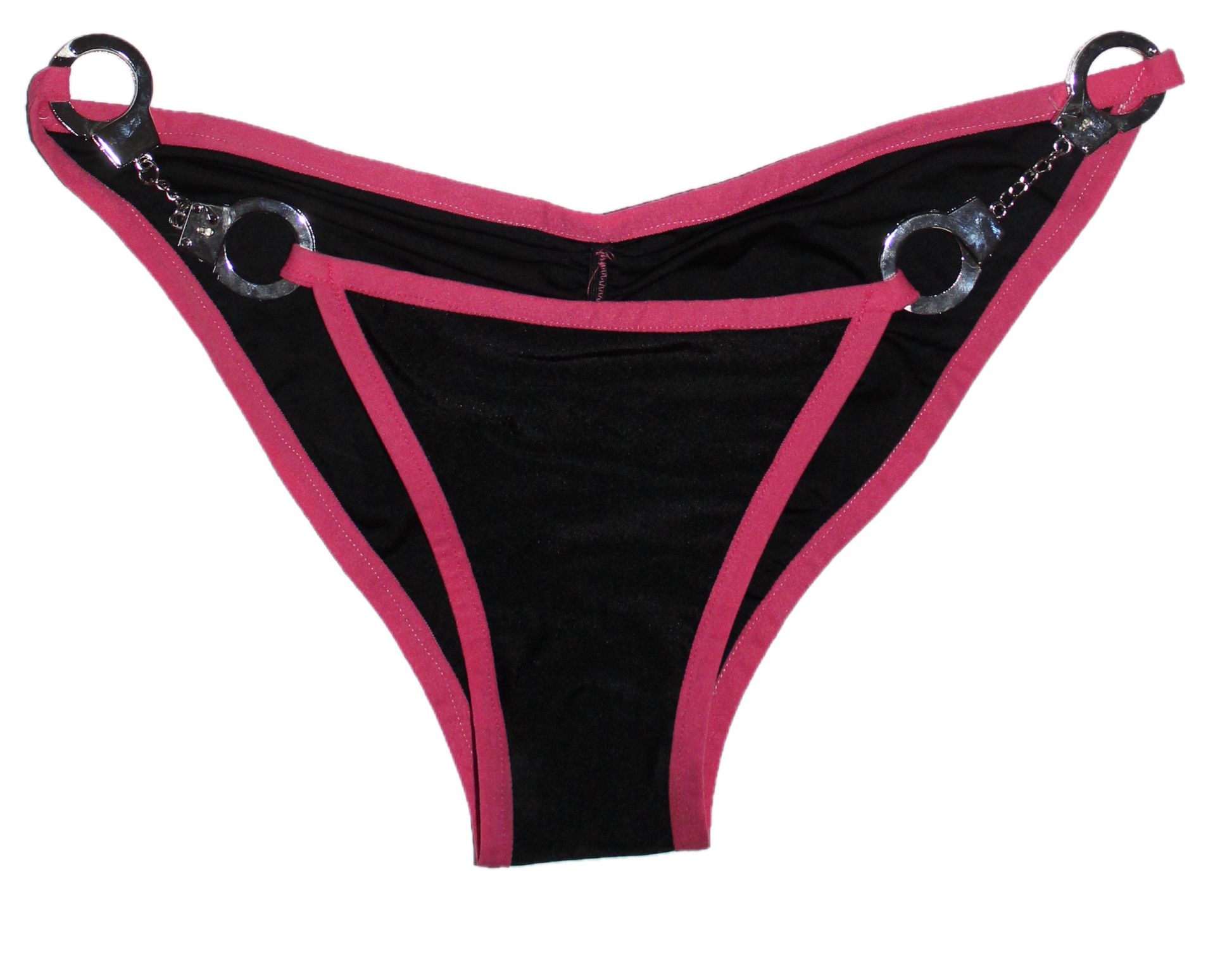 Black bikini scrunch-back bottom lined with either hot pink or red tubing! Made with 4-way stretch material and connected by removable mini hand-cuffs.