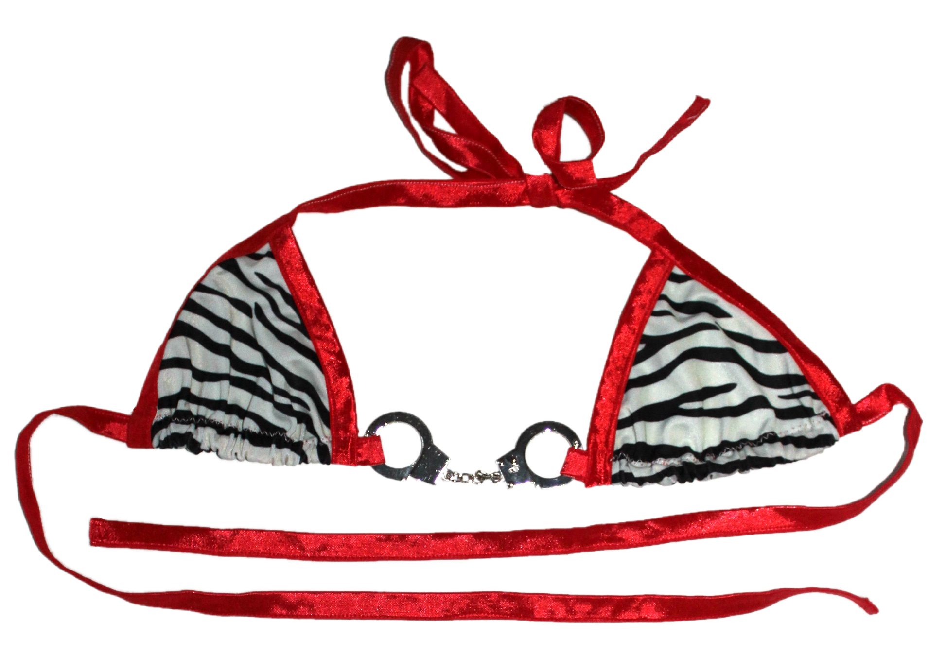 Zebra Printed bikini top lined with either hot pink or bright red tubing! Made with 4-way stretch material and connected by removable mini hand-cuffs.